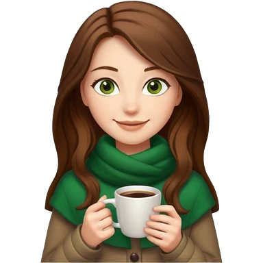 Girl green eyes brown long hair with brown-white winter clothes with coffee in her arms emoji