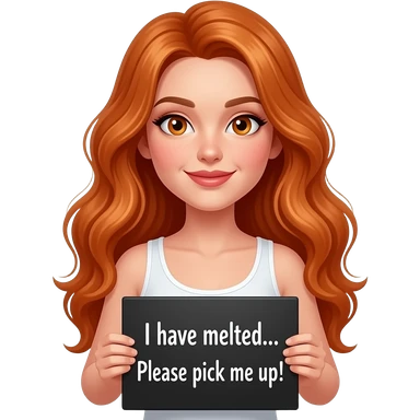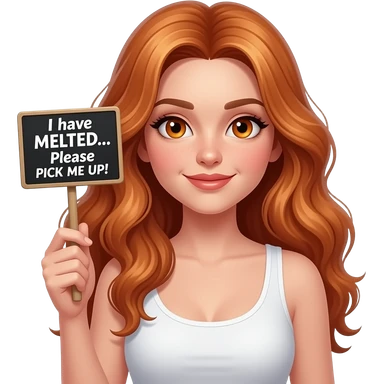 sexy girl with long wavy ginger hair and ginger eyes wearing a white tanktop is holding a black colored sign with I have MELTED... Please PICK ME UP! written on it emoji