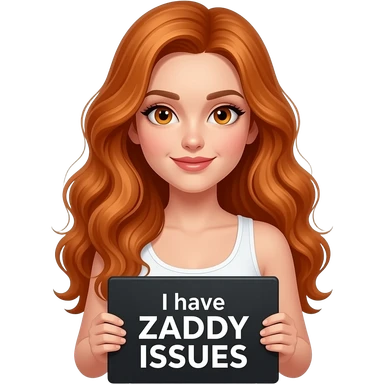 sexy girl with long wavy ginger hair and ginger eyes wearing a white tanktop is holding a black colored sign with I have ZADDY ISSUES written on it emoji