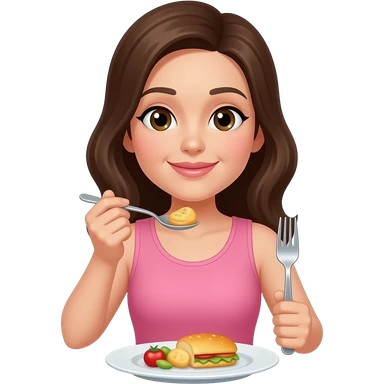 woman holding spoon and fork eating on a plate with little food emoji