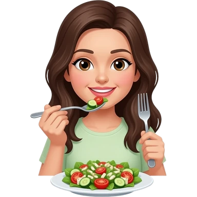 woman holding spoon and fork eating on a plate with salad emoji
