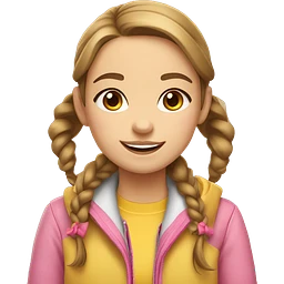 A girl with a smile, blue eyes, light skin, brown pigtails and two pink bows, in a yellow jacket emoji