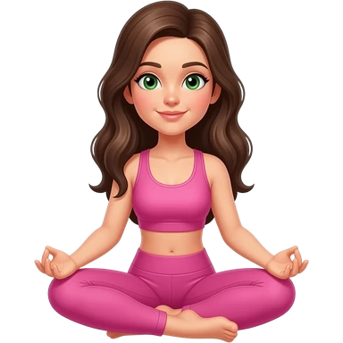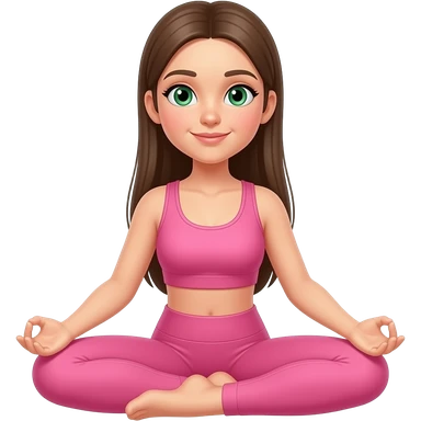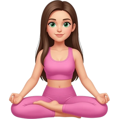 Brown long hair and green eyes yoga girl in light pink clothes sitting on a yoga mat emoji