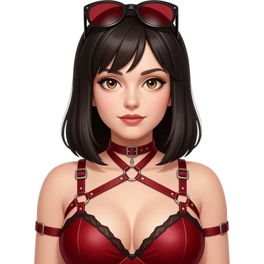 Dominatrix wearing a darkred bdsm style harness lingerie. White skin, chubby, halflong dark hair, hazel eyes. emoji