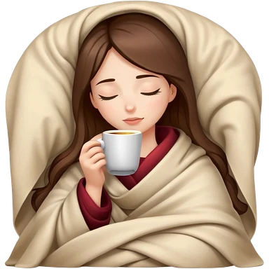 girl inside a blanket sipping coffee eyes closed, brunette with fair skin emoji