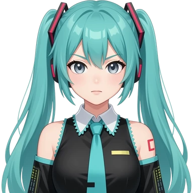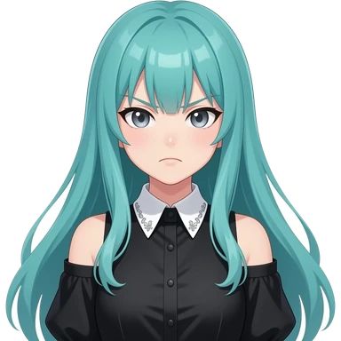 anime girl, angry face, long flowing teal hair, grey eyes, black shoulder cyberpunk blouse with fancy white collar emoji