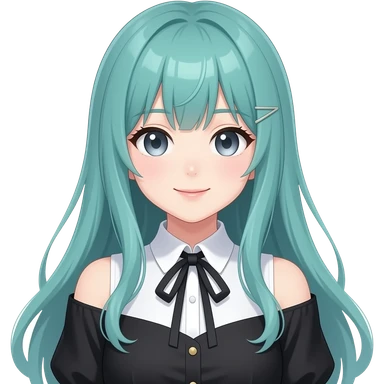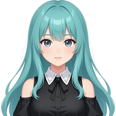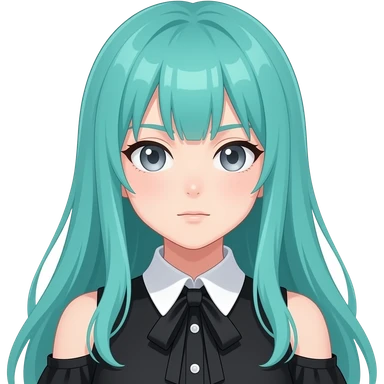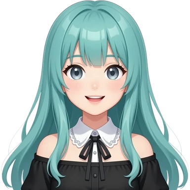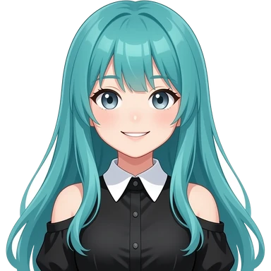 anime girl,happy, long flowing teal hair, grey eyes, black shoulder blouse with fancy white collar emoji