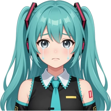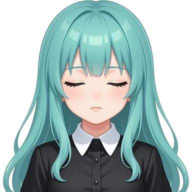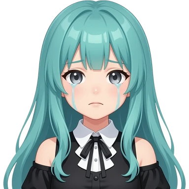 anime girl, crying face, long flowing teal hair, grey eyes, black shoulder cyberpunk blouse with fancy white collar emoji