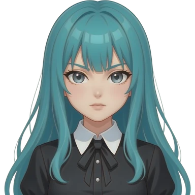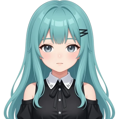 anime girl, mean face, long flowing teal hair, grey eyes, black shoulder cyberpunk blouse with fancy white collar emoji