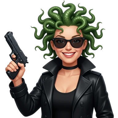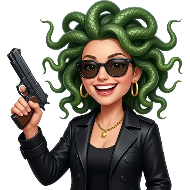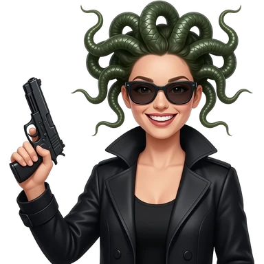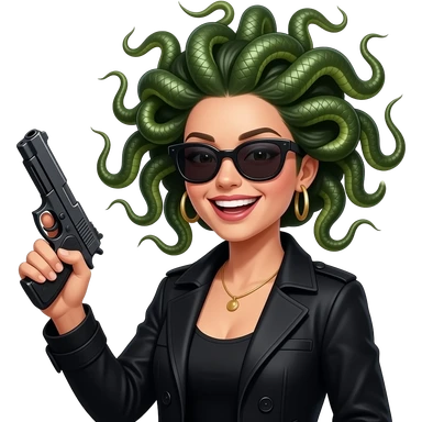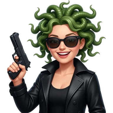 Laughing beautiful female Medusa in black coat with sunglasses holding gun emoji