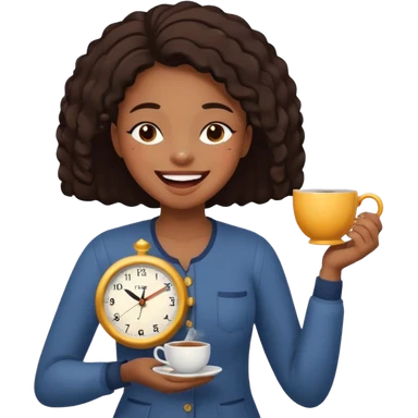 a black girl laughing with her eyes closed with a clock and tea in her hands emoji