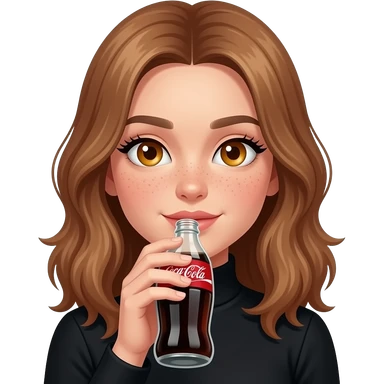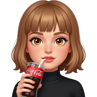 girl with light brown hair and curtain bangs with amber eyes drinking a diet coke wearing a black turtle neck and she has freckles and thick eyelashes emoji