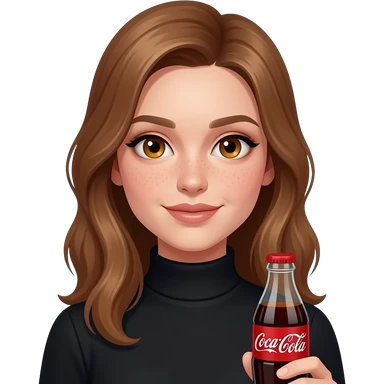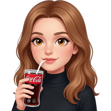 girl with light brown hair with amber eyes drinking a diet coke wearing a black turtle neck and she has freckles and thick eyelashes emoji