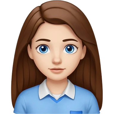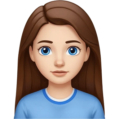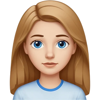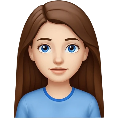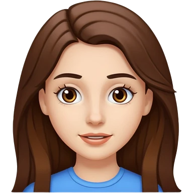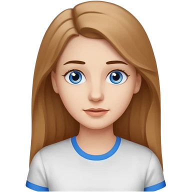 girl with long sleek brown hair, light green eyes and natural makeup. her facial expressions should be neutral with soft, arched eyebrows and a slight smile, wearing a white t-shirt. emoji