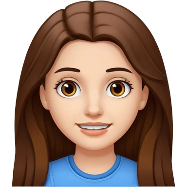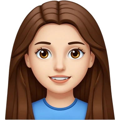 A pretty white girl with long brown hair dark eyebrows and braces and blue eyes wearing a white shirt emoji