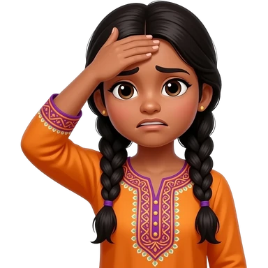 brown skin, long black hair in a singular braid, orange kurti with purple and green patterns girl who slapping her forehead and frowning and crashing out emoji