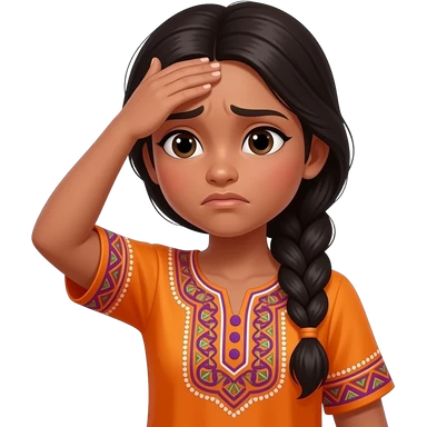brown skin, long black hair in a braid, orange kurti with purple and green patterns girl who slapping her forehead and frowning and crashing out emoji