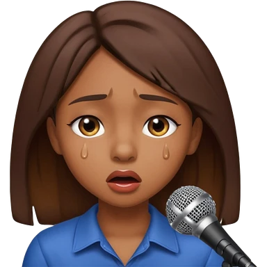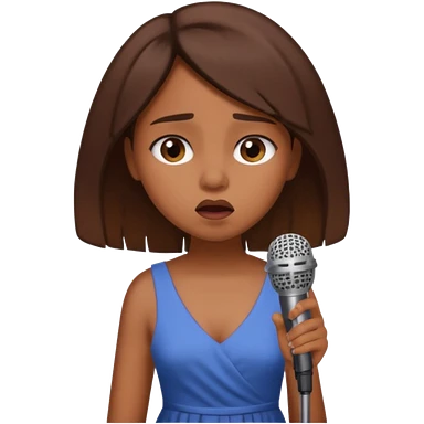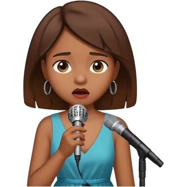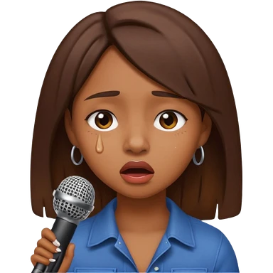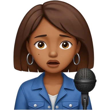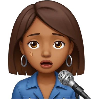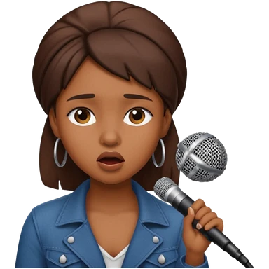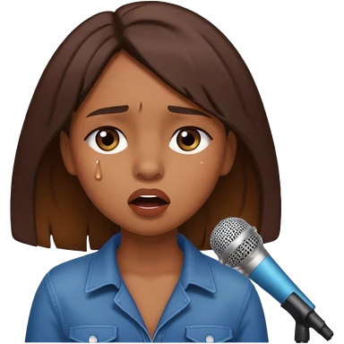 Brown skin girl with a long ponytail singing into a microphone looking sad with music notes coming out emoji
