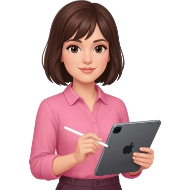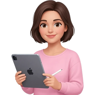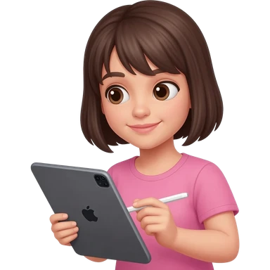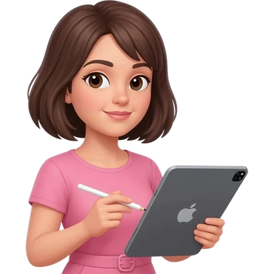 Brune aux cheveux court sans frange qui prend son temps tout doucement avec son grand iPad et un Apple Pencil. Vêtements rose emoji