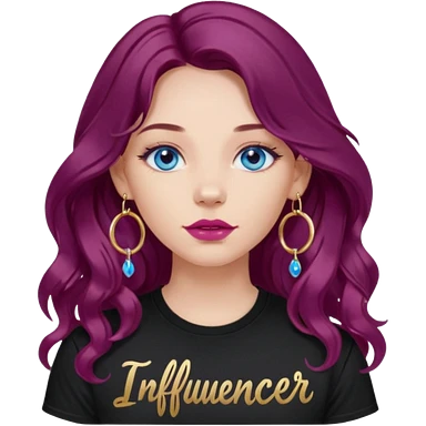 Girl with burgundy purple wavy long hair blue eyes wearing a black tshirt "influencer " in pink lettering font, large gold hoop earrings & lip piercing emoji