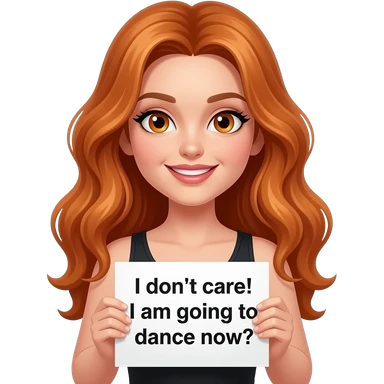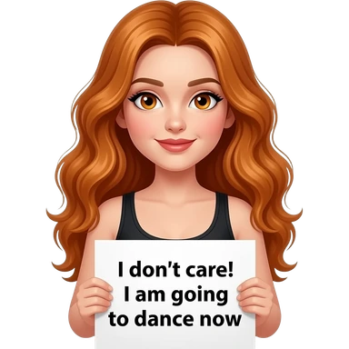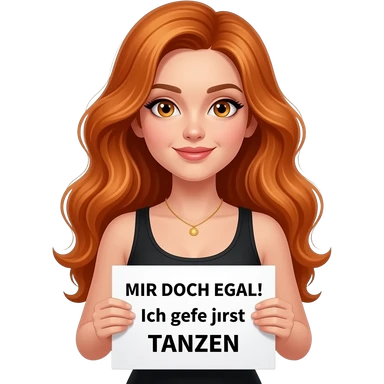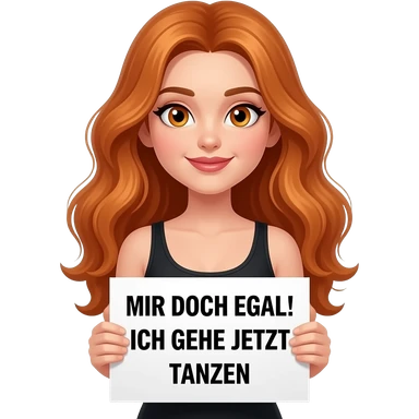 sexy girl with long wavy ginger hair and ginger eyes wearing a black tanktop is holding a white colored sign with MIR DOCH EGAL! ICH GEHE JETZT TANZEN written on it emoji