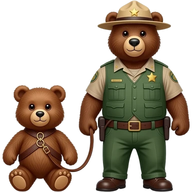 smokey the bear on all fours as a teddy bear being walked on a leash in a leather harness by a larger park ranger bearbear emoji