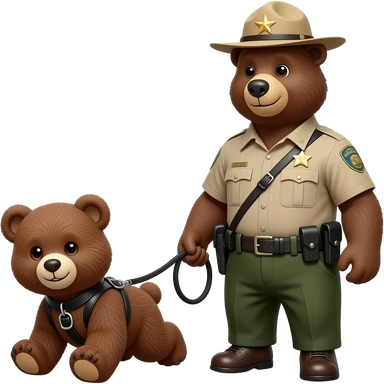 smokey the bear on all fours as a teddy bear being walked on a leash in a black leather harness by a larger park ranger bearbear emoji