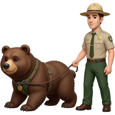 smokey the bear on all fours being walked on a leash in a harness by a park ranger emoji