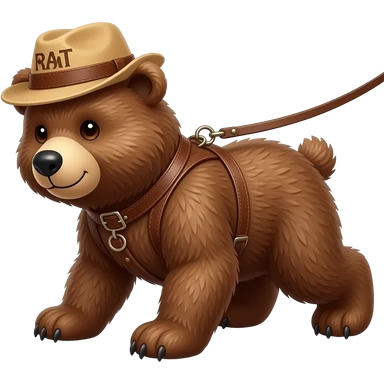 smokey the bear on all fours as a teddy bear being walked on a leash in a leather harness emoji