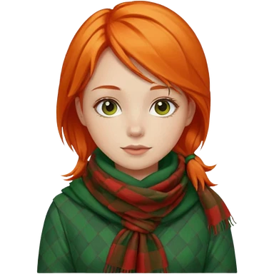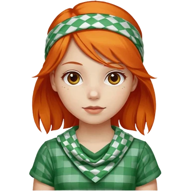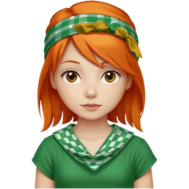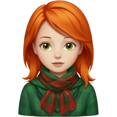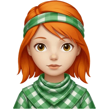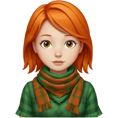 girl orange hair, wear red checkered scarf, green dress emoji | AI Emoji Generator