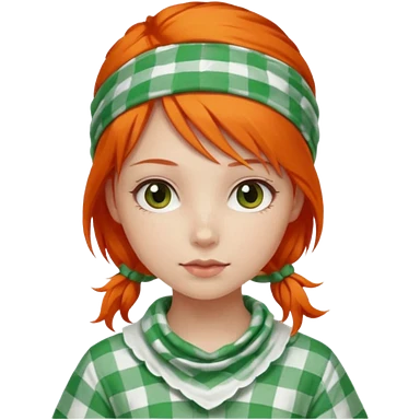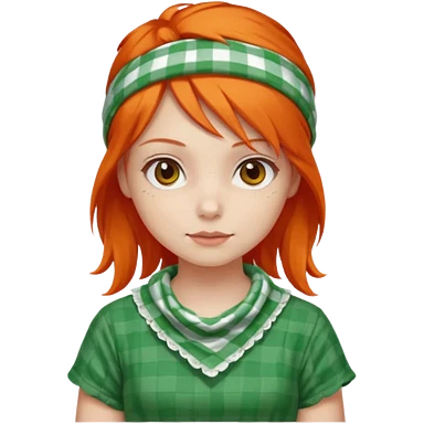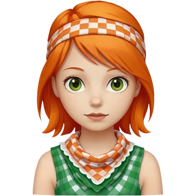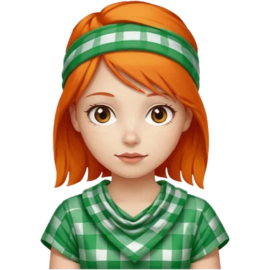 girl orange hair, wear red and white checkered bandana, green dress emoji