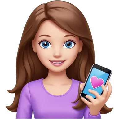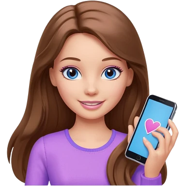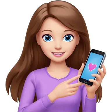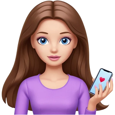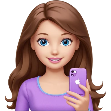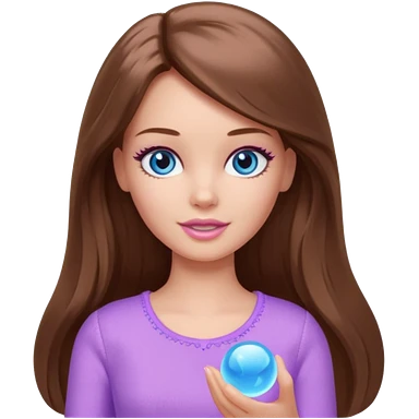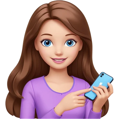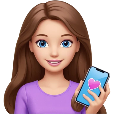 beautiful barbie girl with long brown hair, blue eyes and wearing light purple clothes playing games emoji