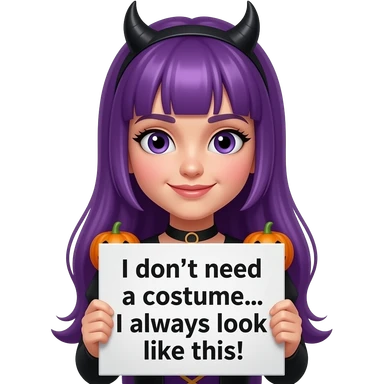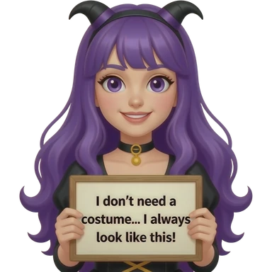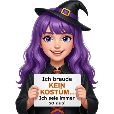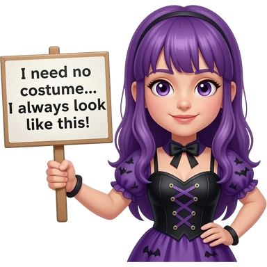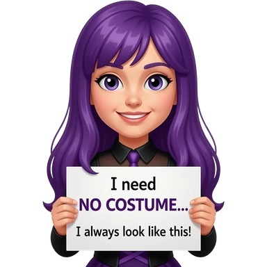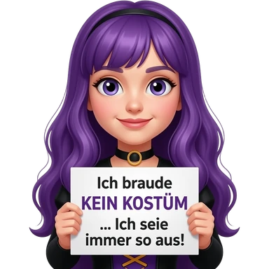 girl with long purple hair wearing a halloween costume holding a Ich brauche KEIN KOSTÜM... Ich sehe immer so aus! sign emoji