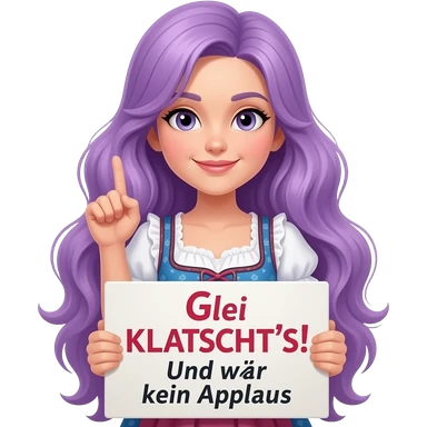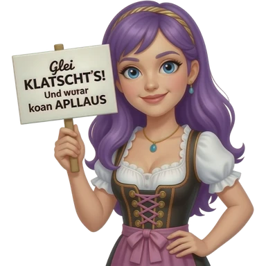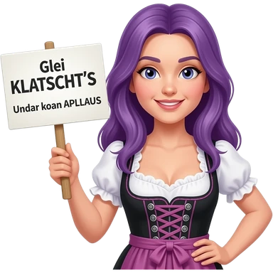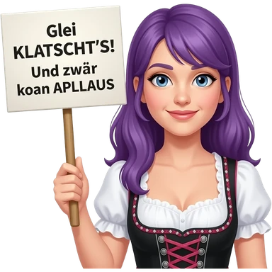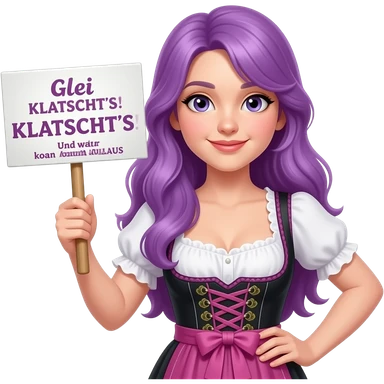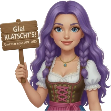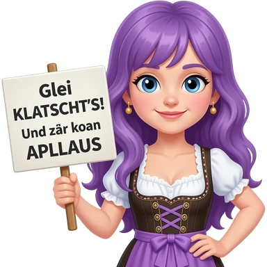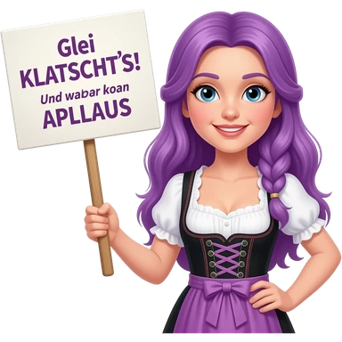 girl with long purple hair wearing a dirndl holding a Glei KLATSCHT'S! Und zwar koan APLLAUS sign emoji