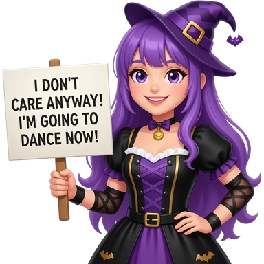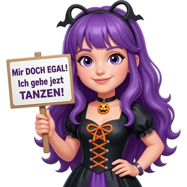 girl with long purple hair wearing a halloween costume holding a Mir DOCH EGAL! Ich gehe jetzt TANZEN! sign emoji