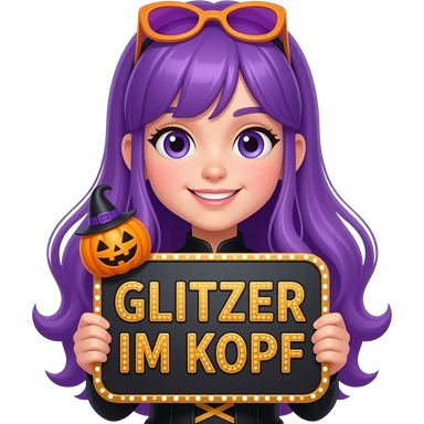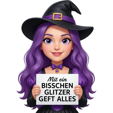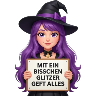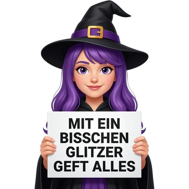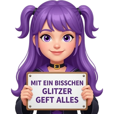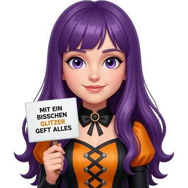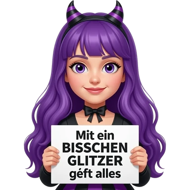 girl with long purple hair wearing a halloween costume holding a MIT EIN BISSCHEN GLITZER GEHT ALLES sign emoji