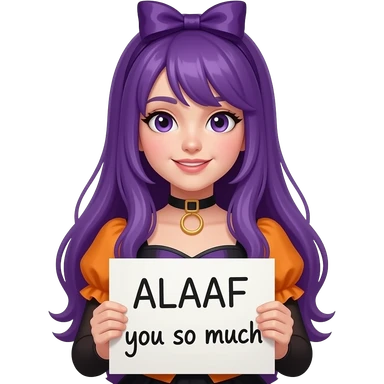 girl with long purple hair wearing a halloween costume holding a ALAAF you so much sign emoji