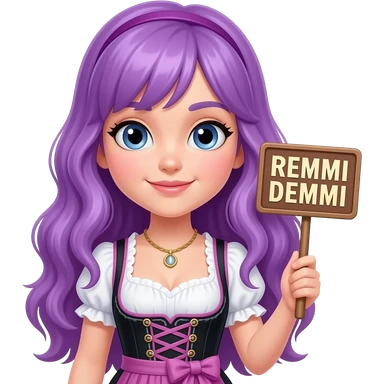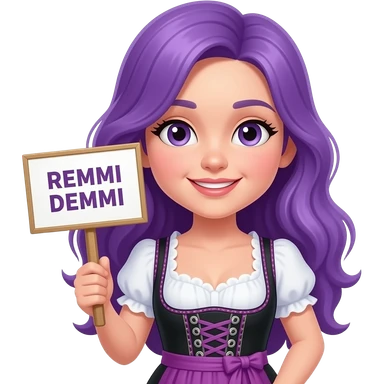girl with long purple hair wearing a dirndl holding a REMMI DEMMI sign emoji