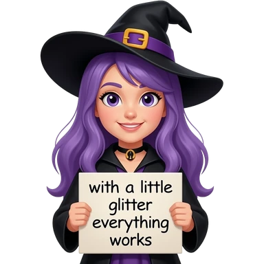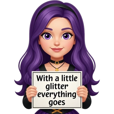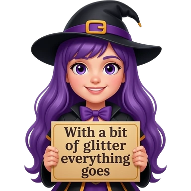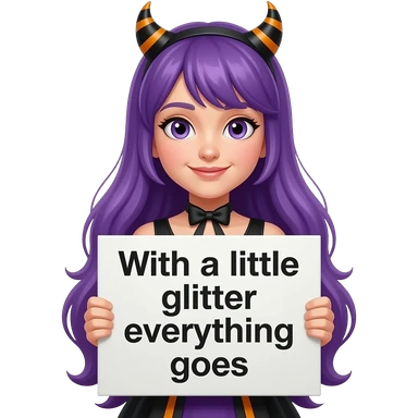 girl with long purple hair wearing a halloween costume holding a Mit ein BISSCHEN GLITZER GEHT ALLES sign emoji