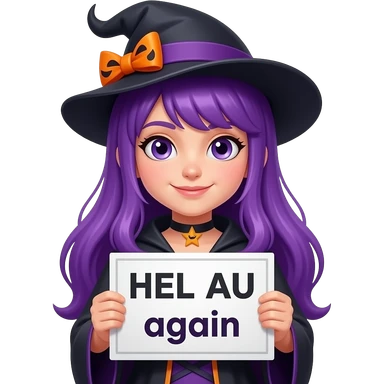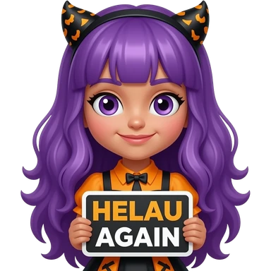 girl with long purple hair wearing a halloween costume holding a HELAU again sign emoji