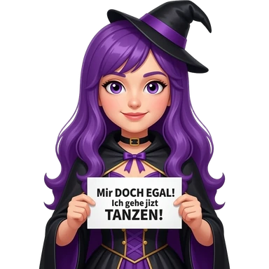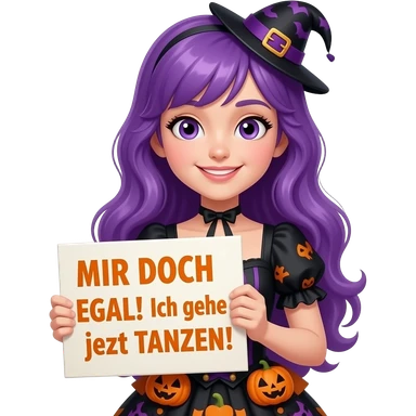 girl with long purple hair wearing a halloween costume holding a MIR DOCH EGAL! Ich gehe jetzt TANZEN! sign emoji