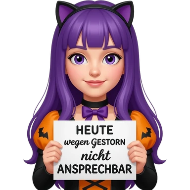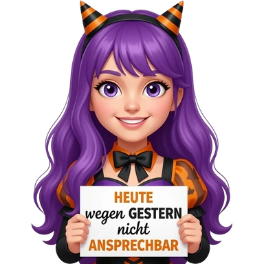 girl with long purple hair wearing a halloween costume holding a HEUTE wegen GESTERN nicht ANSPRECHBAR sign emoji