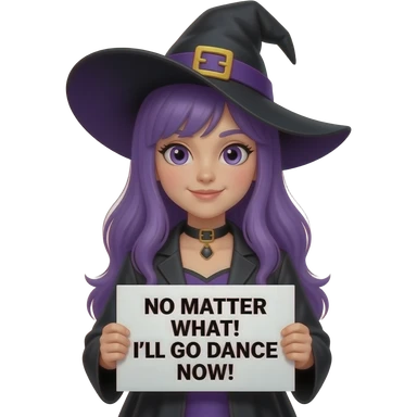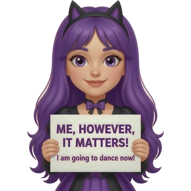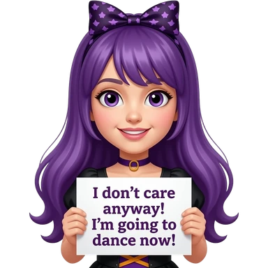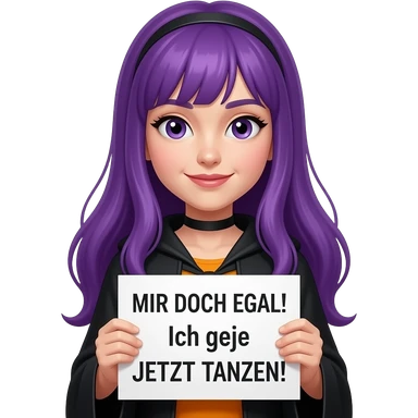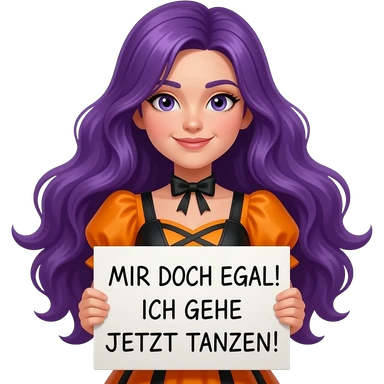 girl with long purple hair wearing a halloween costume holding a MIR DOCH EGAL! ICH GEHE JETZT TANZEN! sign emoji