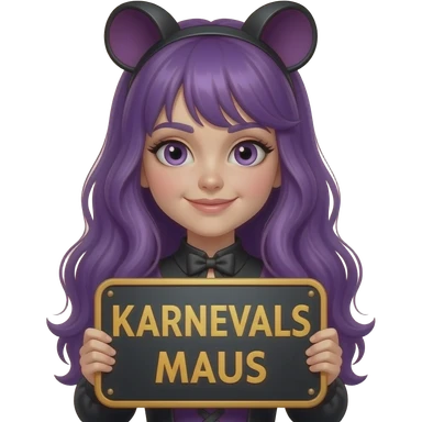girl with long purple hair wearing a halloween costume holding a KARNEVALS MAUS sign emoji
