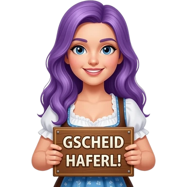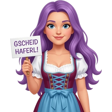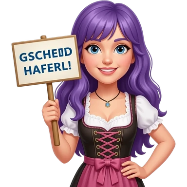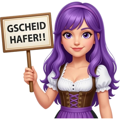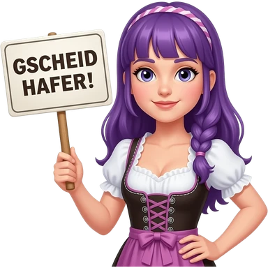 girl with long purple hair wearing a dirndl holding a GSCHEID HAFERL! sign emoji