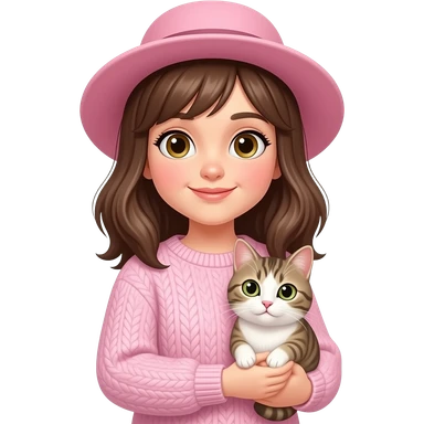 Girl with brown hair wearing a pink hat, light pink sweater, with brown hair holding a cat emoji