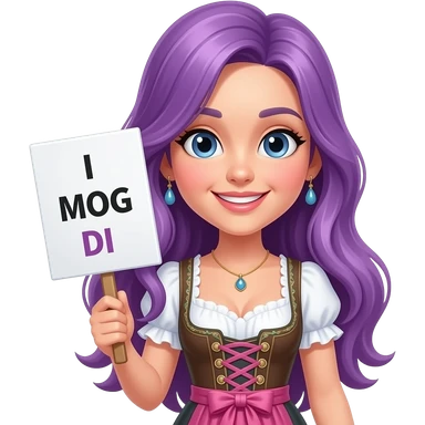 girl with long purple hair wearing a dirndl holding a I red BOARISCH und Du? sign emoji