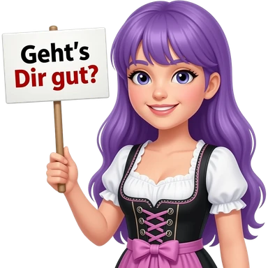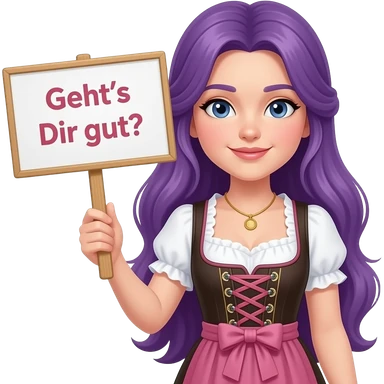 girl with long purple hair wearing a dirndl holding a Geht's Dir gut? sign emoji