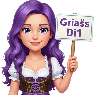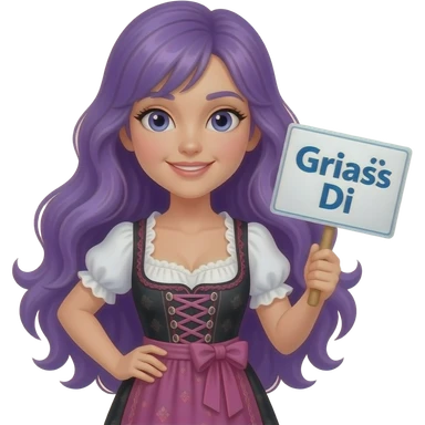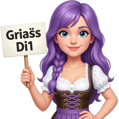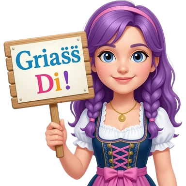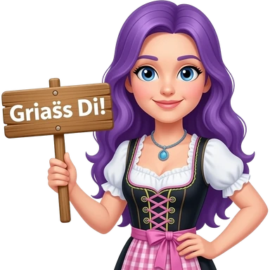 girl with long purple hair wearing a dirndl holding a Griaß Di! sign emoji