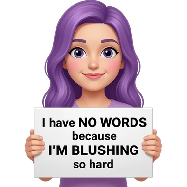 girl with long purple hair holding a I have NO WORDS because I'M BLUSHING so hard sign emoji